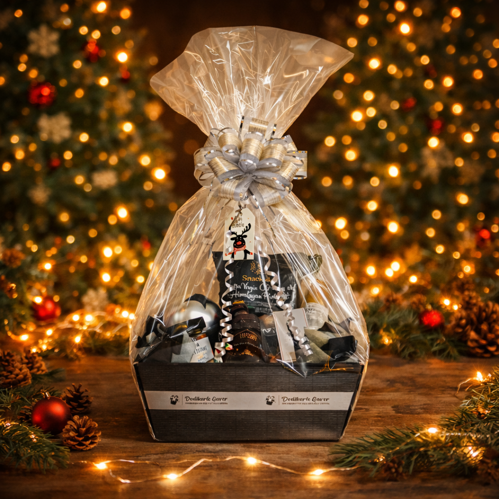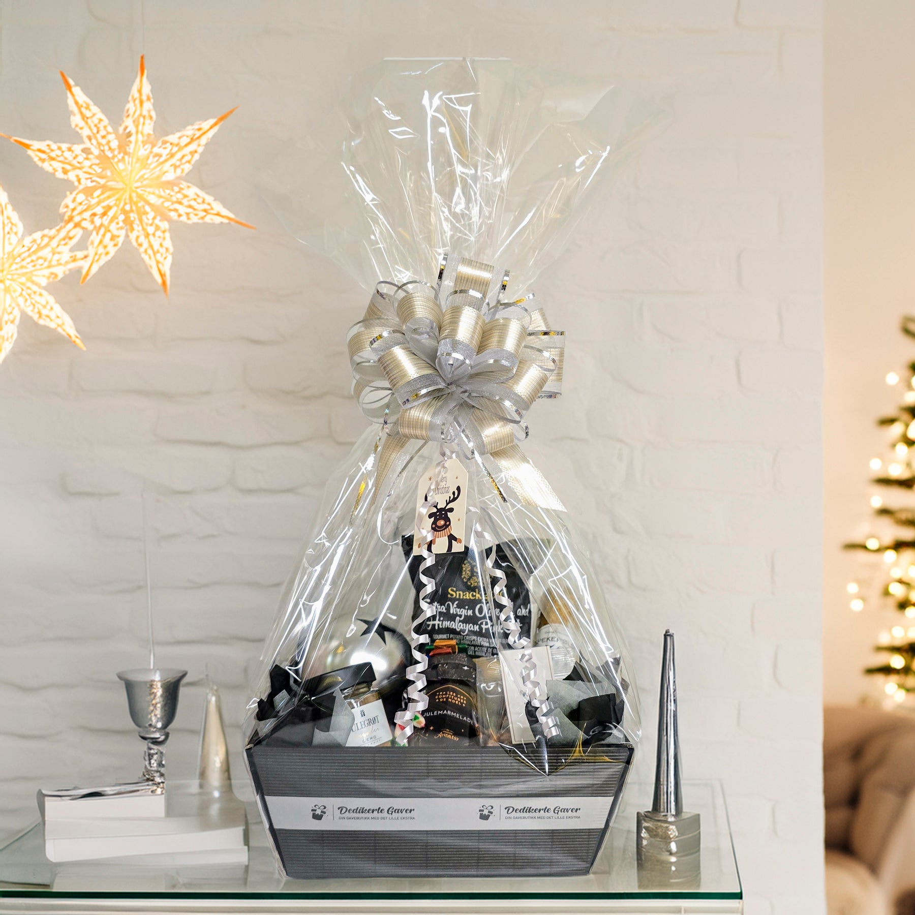 En gjennomført julekurv som er klar til å gis bort.