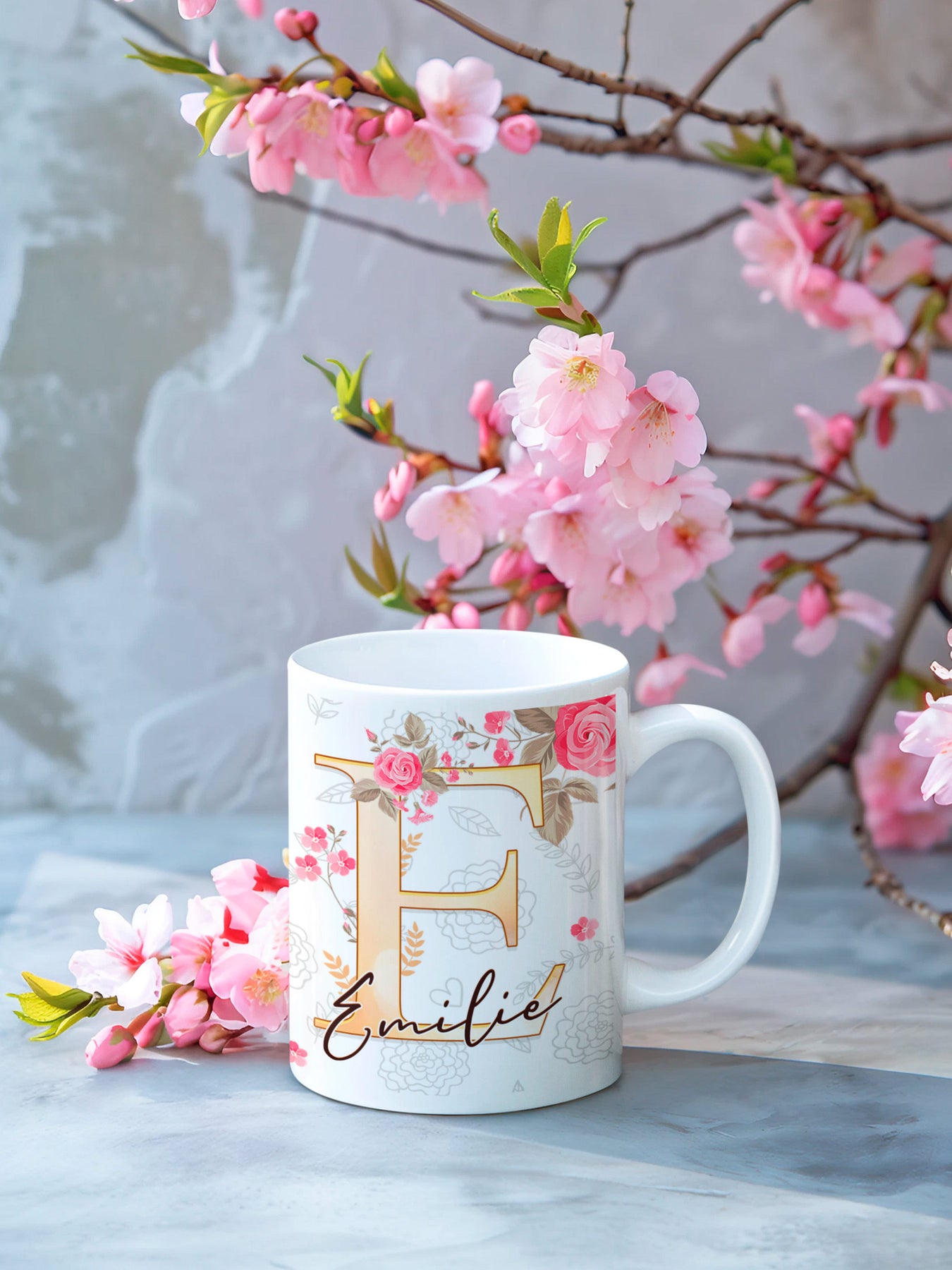Hvit keramikkopp med personlig navn, stor gullfarget bokstav og rosa blomsterdetaljer