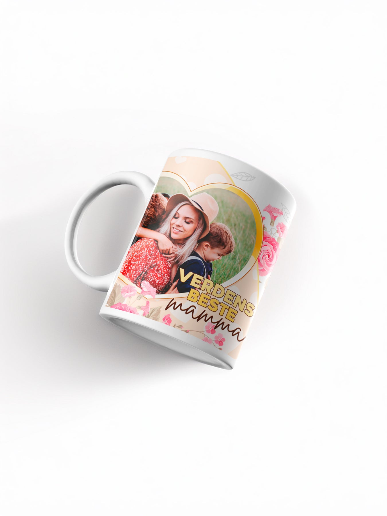 Personlig kaffekopp til mamma med blomsterdesign, bilde i hjerteform og navn